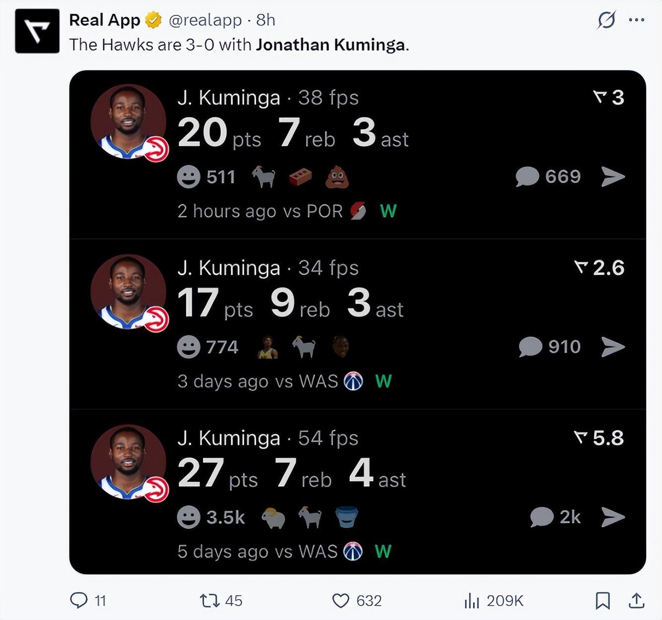 此役库明加全场比赛25分钟,10中7,三分2中1,罚球7中5,拿到20分7篮板3助攻2抢断,命中率70%,三分命中率50%,真实命中率76.5%,正负值20+,他登场的三场比赛老鹰队都拿到胜利。