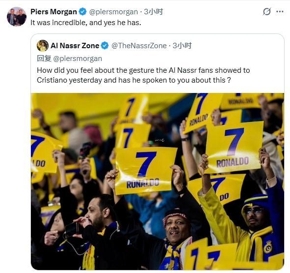 此前,因为不满沙特联的转会运作方式,已经连续两轮未参加利雅得胜利比赛。而摩根自然不会放过这一热点事件,他在回复网友的留言时,毫无意外地表达了对C罗的支持。摩根直言:“我完全理解他的感受,并且我百分之百支持他。”