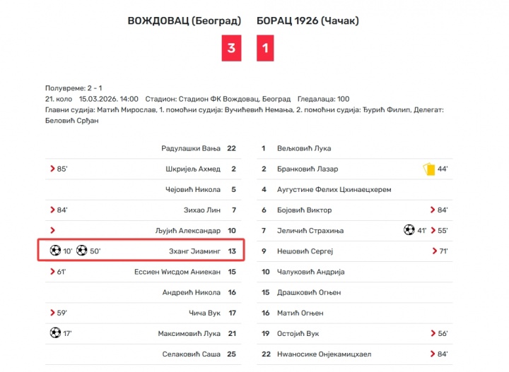 03月16日讯 3月15日,塞尔维亚U19全国联赛(1)第21轮,沃日多瓦茨U19以3-1战胜博拉茨U19。中国球员张家鸣首发踢满全场梅开二度,在加入沃日多瓦兹U19队后,出场的3次全首发打入三球,累计上场时间为269分钟。另外一名中国球员林子皓本场首发出场84分钟送助攻。第18轮,张家鸣进名单未出场第19轮,张家鸣首发进1球第20轮,张家鸣首发没进球第21...